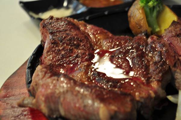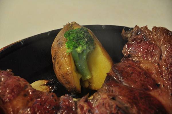 這盤子裡除了35盎司的牛排外,還有數根洋蔥及一顆小番薯。