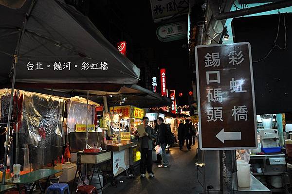 在饒河夜市裡,可以看到立著彩虹橋、錫口碼頭的字眼,沿著指標過去即可抵達。