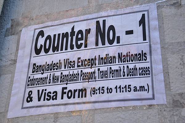 孟加拉簽證申辦處在這個不起眼的轉角,抵達後先到Counter No.1和辦事員領取簽證申請表格,內容就是一些基本資料(包含孟加拉旅館地址),在此就不多簡述。填寫完畢將兩吋照片兩張、護照影本、印度簽證影本及護照正本交給櫃台辦事員,等他登記完畢會給你一張收據並於11:30到大使館裡面進行面談,費用由面試官收取。