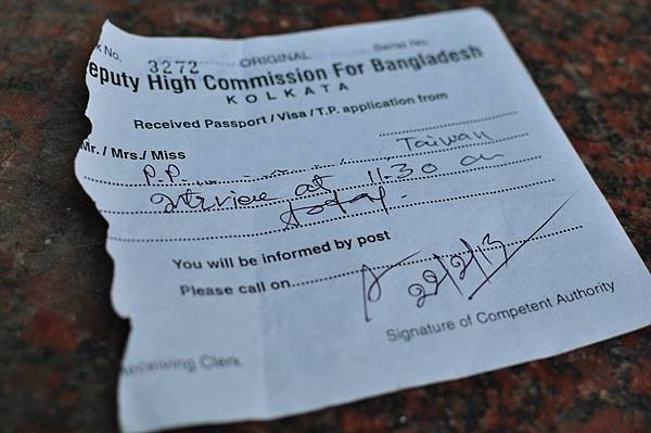 一切辦妥就等翌日下午(17:00)再到孟加拉大使館一趟,這回僅需Counter No.1把收據交給辦事員,就能領回護照及熱騰騰的孟加拉簽證。