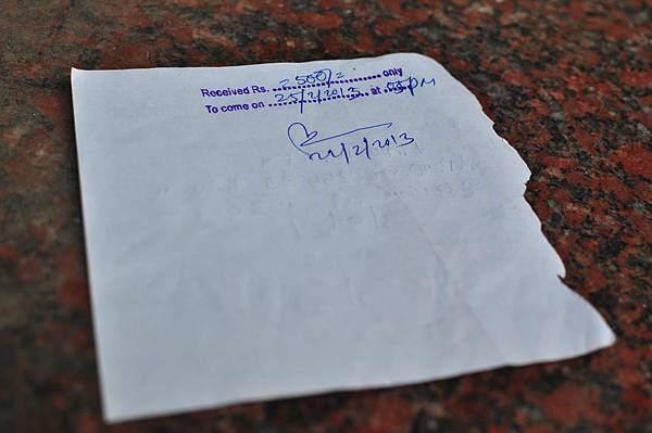 面試官收完簽證費,會在收據背面寫上簽證費用及領取簽證時間,一般為翌日下午。假設要當天取件,得多支付1600盧比。