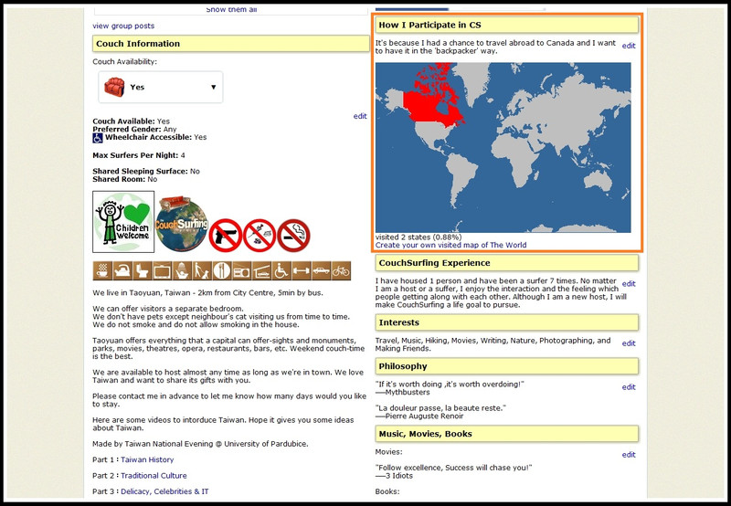 但我想分享的是,你/妳知道CouchSurfing可以貼上HTML語法嗎?這樣一來可以讓你/妳的個人檔案更有質感哦。