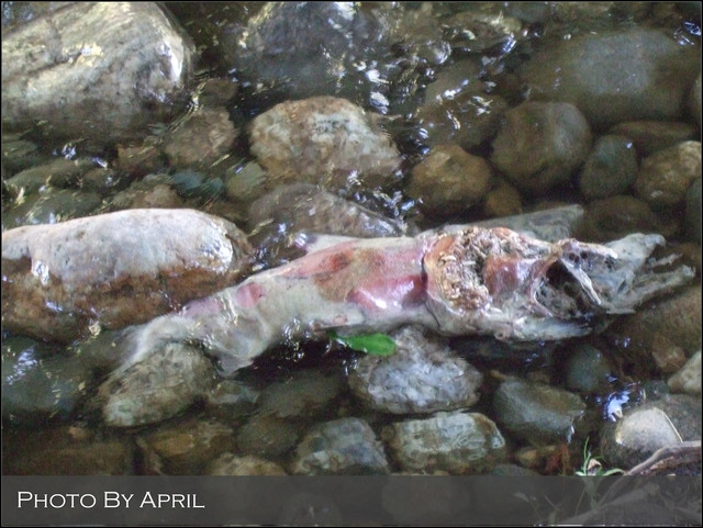 你沒聞錯,這股臭味便是鮭魚們竭盡所能的產卵後,死於河中的屍臭味。
